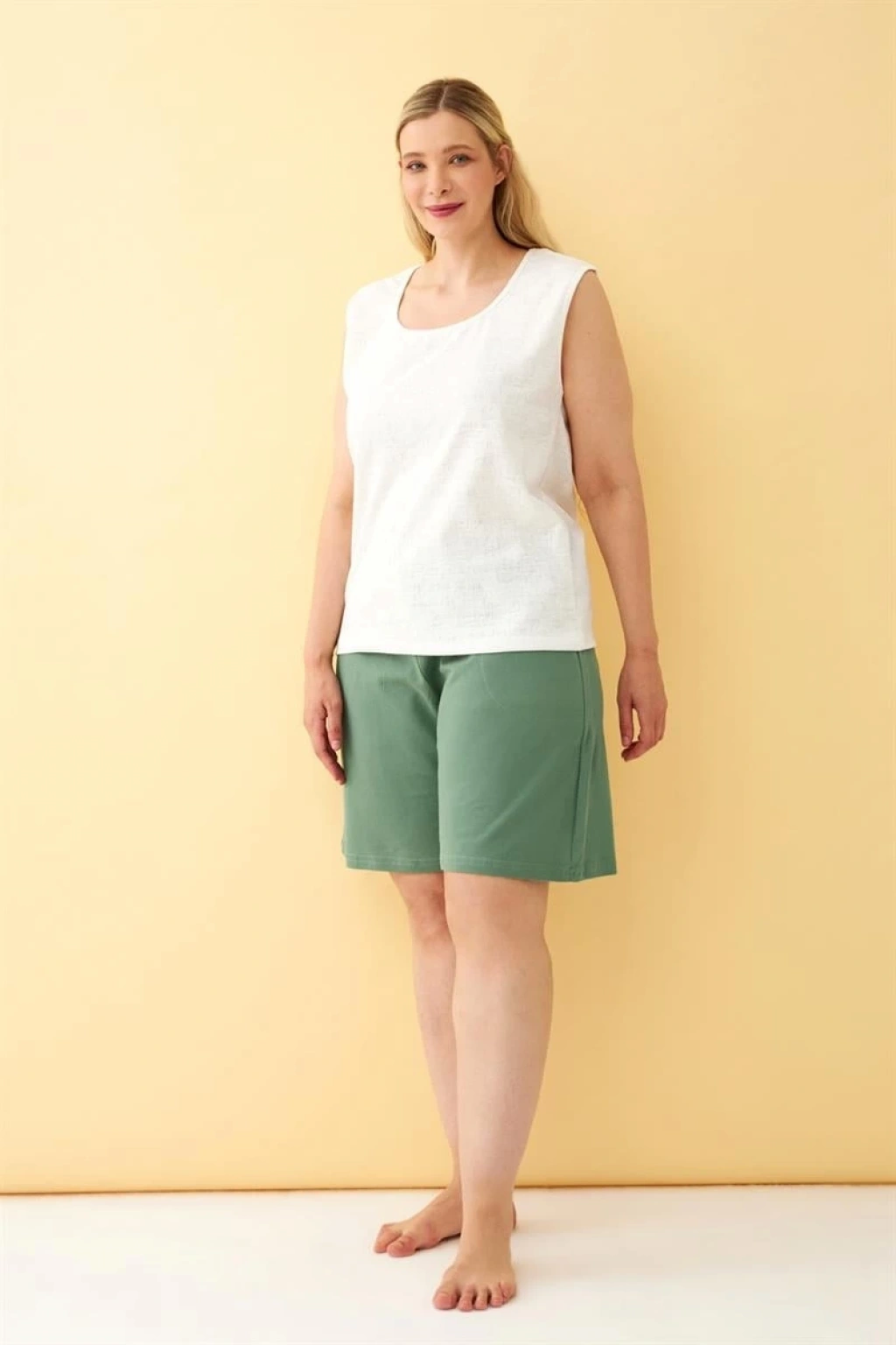 Büyük beden kadın şort arayışında olanlar için ideal bir seçenek: Çamaşır Kenti'nin rahat kesimli yeşil cepli şortu!