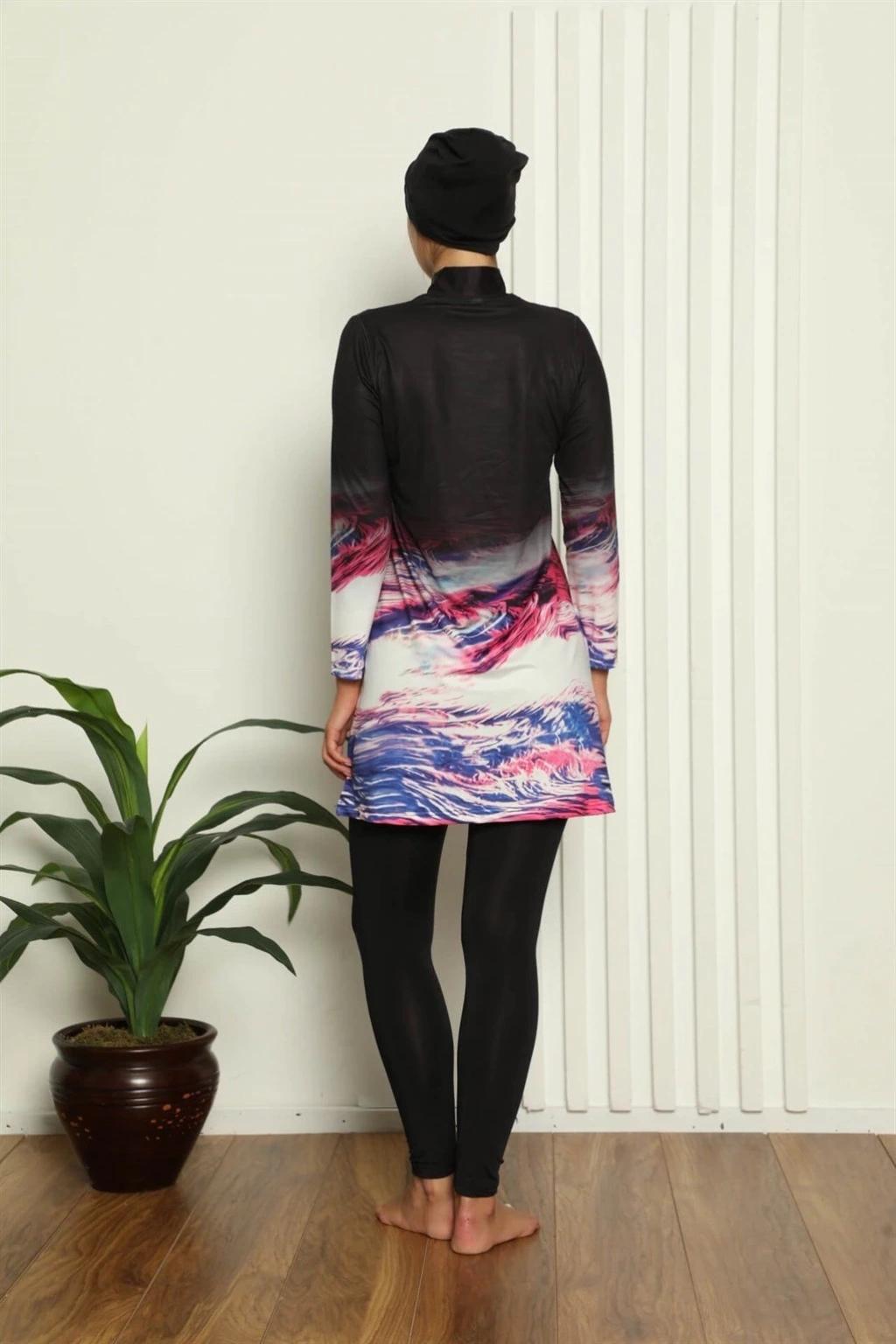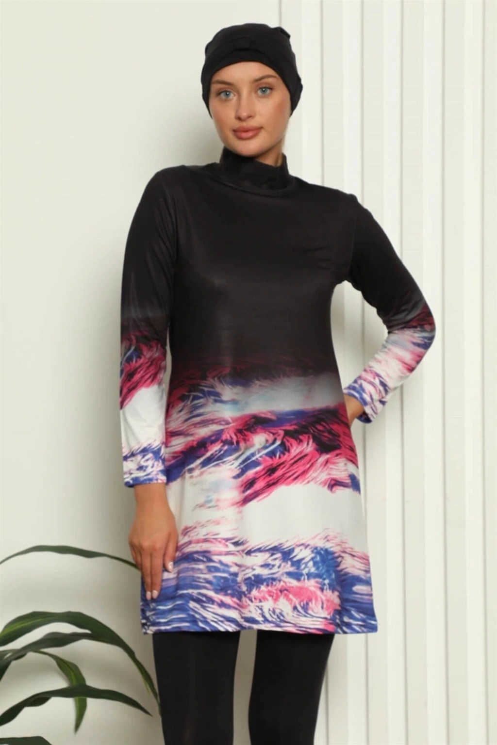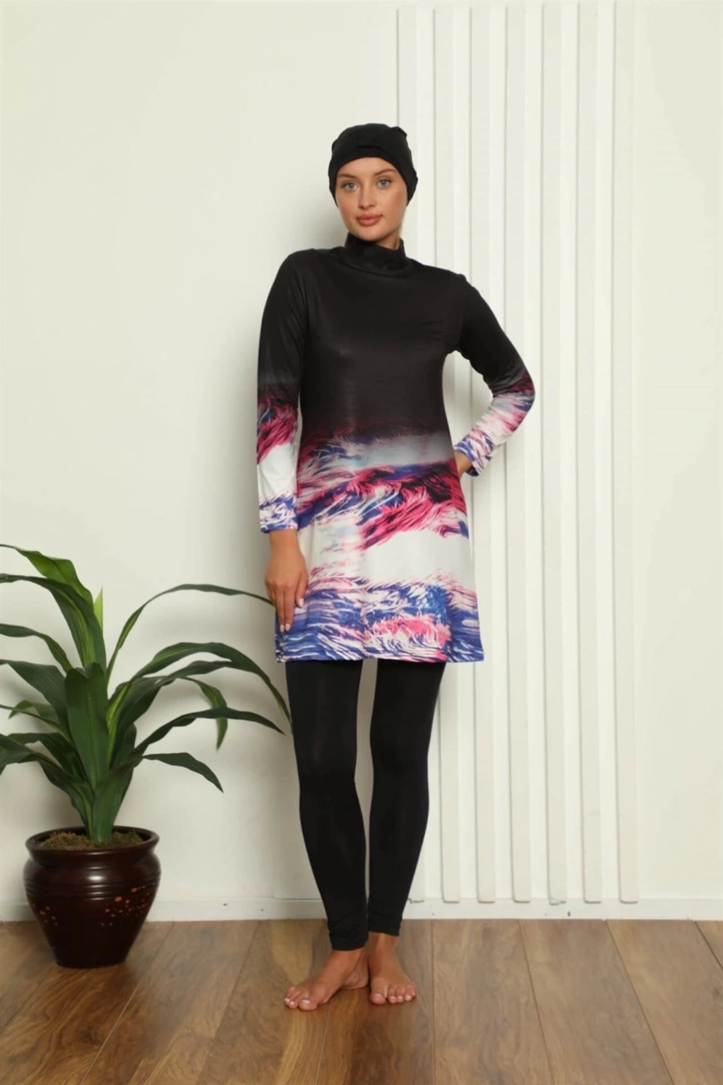 Siz de plajda şıklığınızı ve örtünmeyi bir arada yaşamak istiyorsanız, Tam Tesettür Dijital Desenli Mayo Siyah tam size göre!
