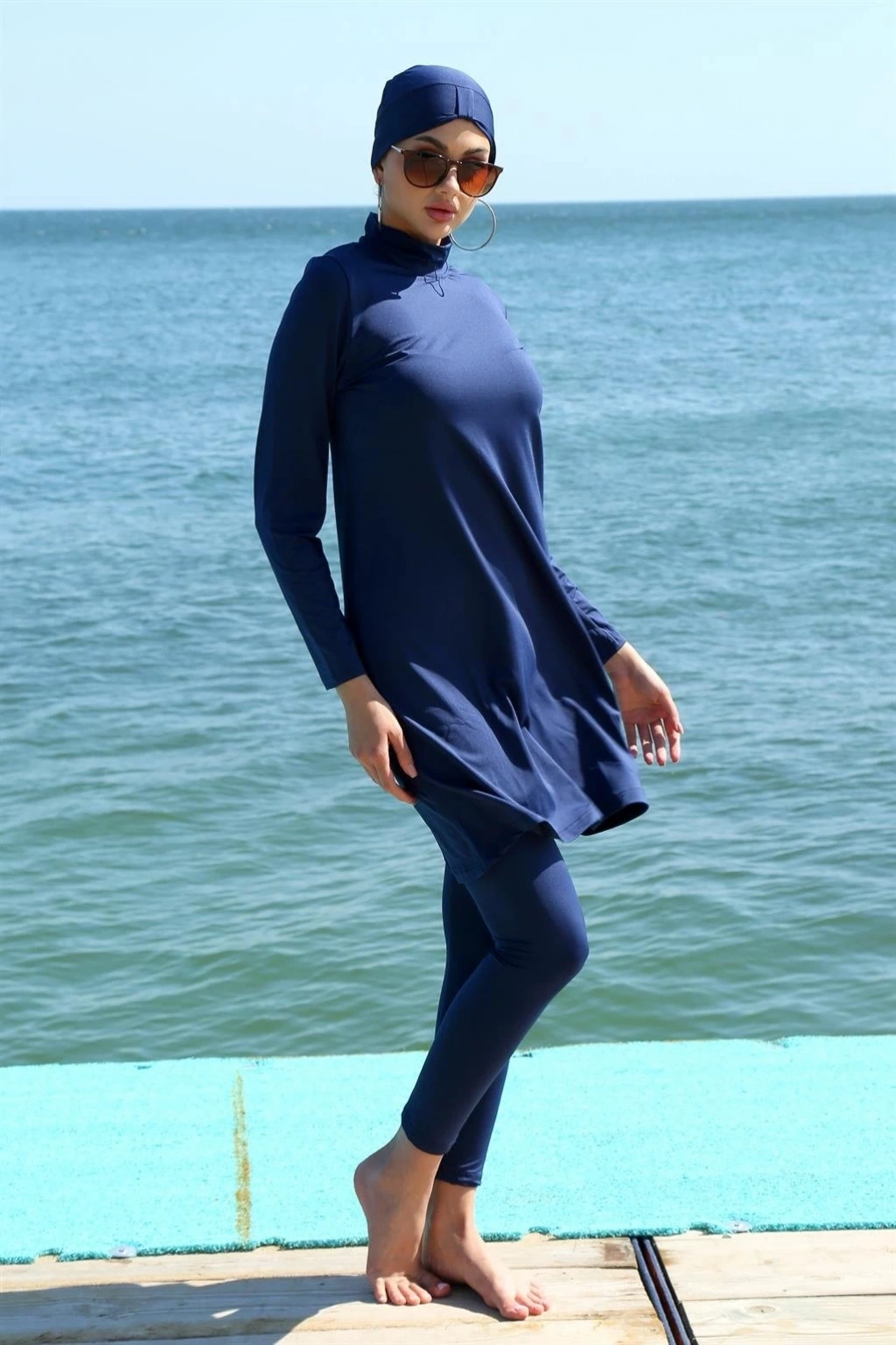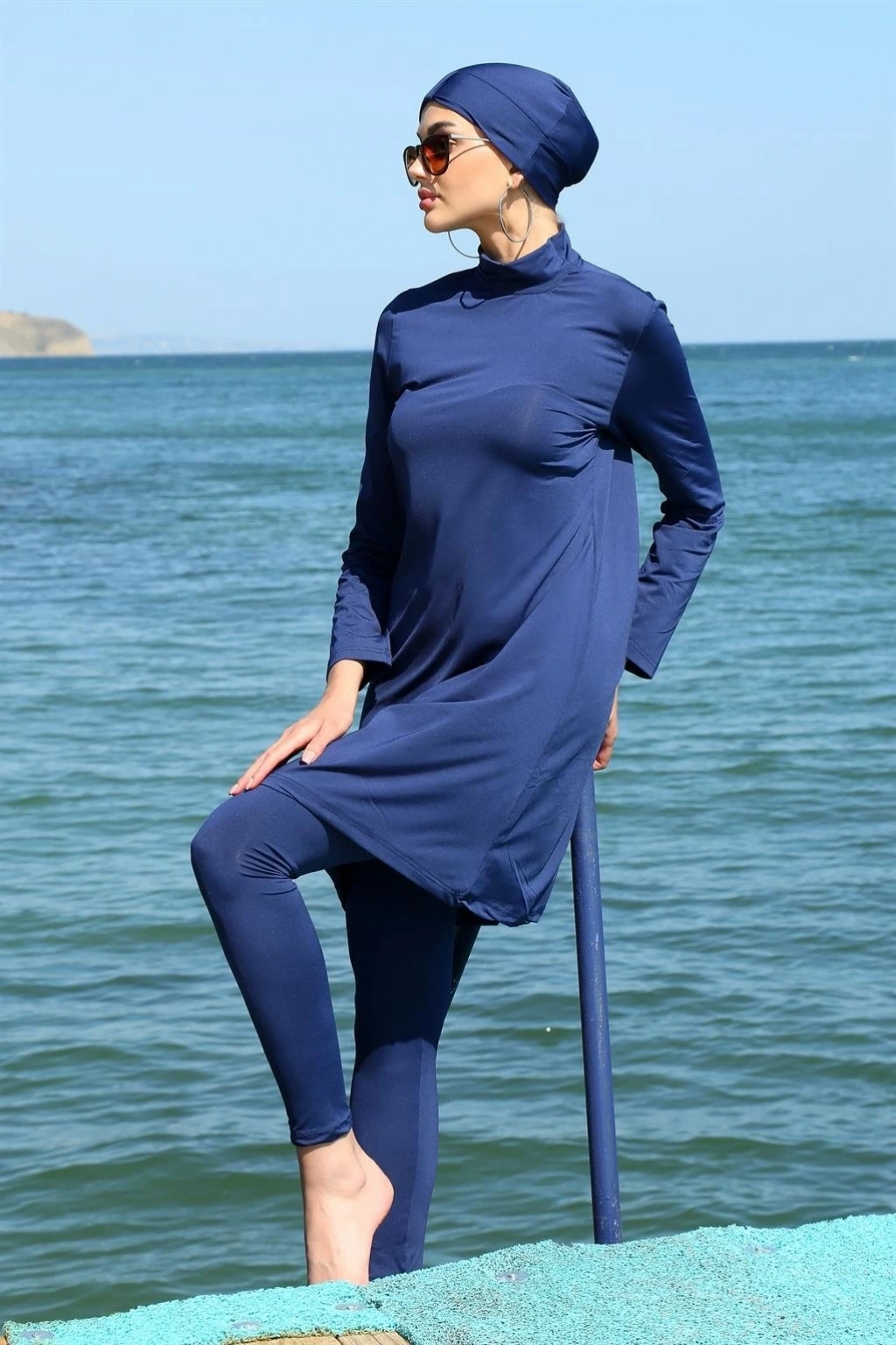 Çamaşır Kenti'nin muhteşem tasarımı Uzun Kol Likralı Lacivert Tesettür Mayo, plaj şıklığınızı tamamlamak için ideal bir seçimdir.