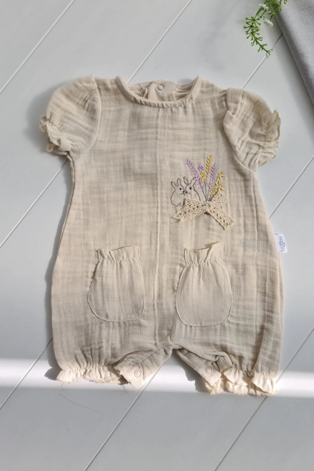 Müslin Kumaş Çiçek Nakışlı Pamuklu Kız Bebek Tulum