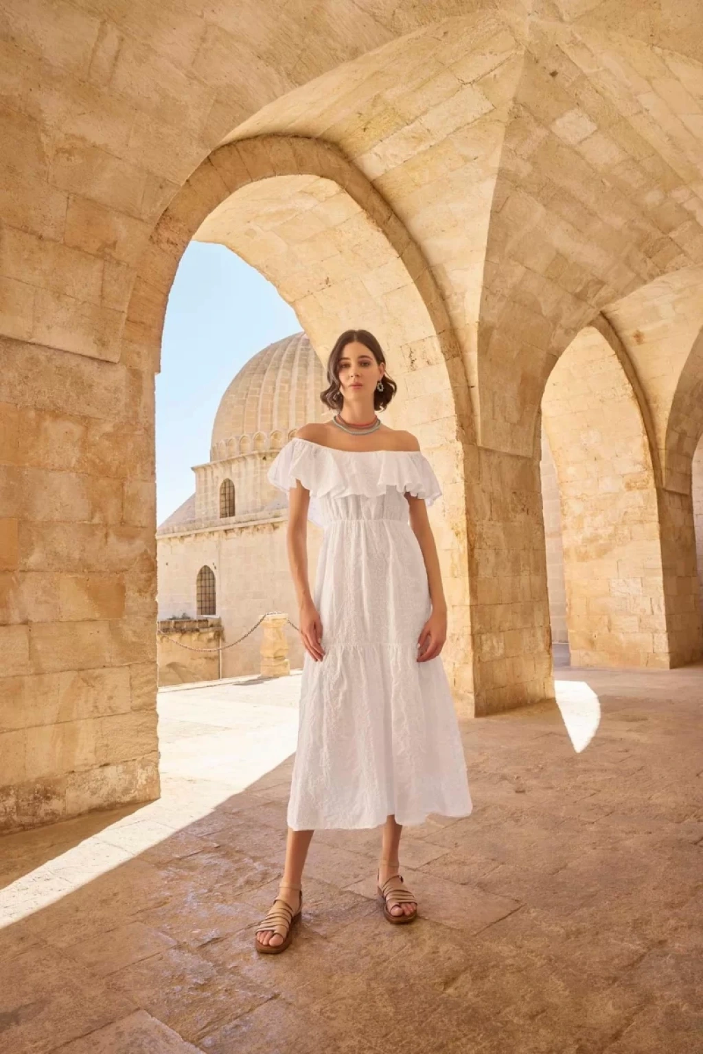 Elbise: Beyaz renklidir, kayık yakalıdır, kısa kolludur, dokuma kumaştır.