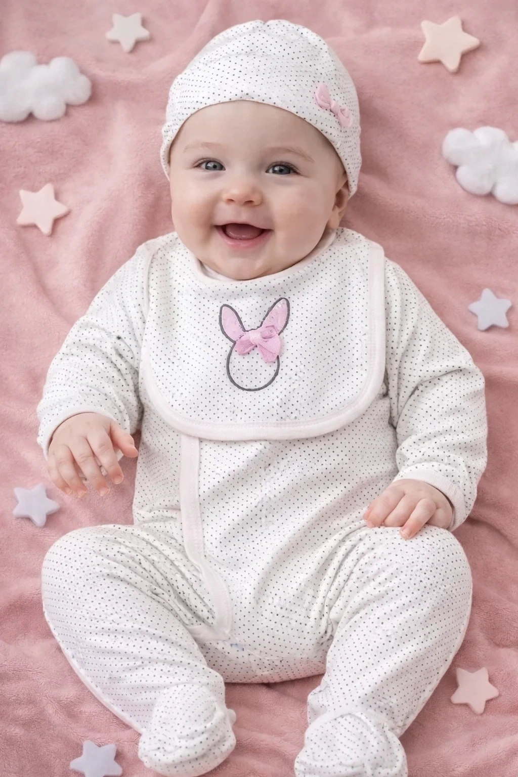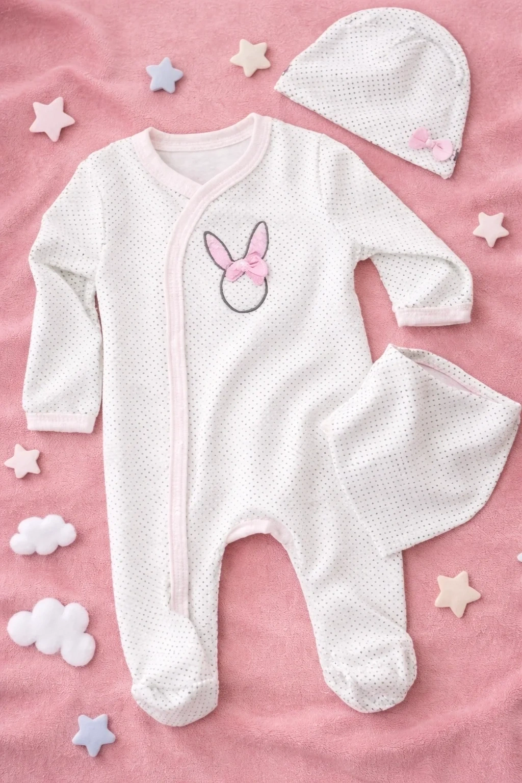 Sevimli tavşan nakış detayıyla tasarlanan bu 4’lü set, günlük kullanımda ve özel anlarda bebeğinize tatlı bir görünüm kazandırır.